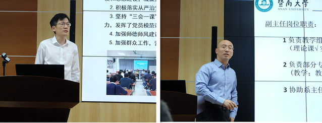 ▲光电系卢惠辉主任作系班子及个人述职、朱思祁副主任作个人述职