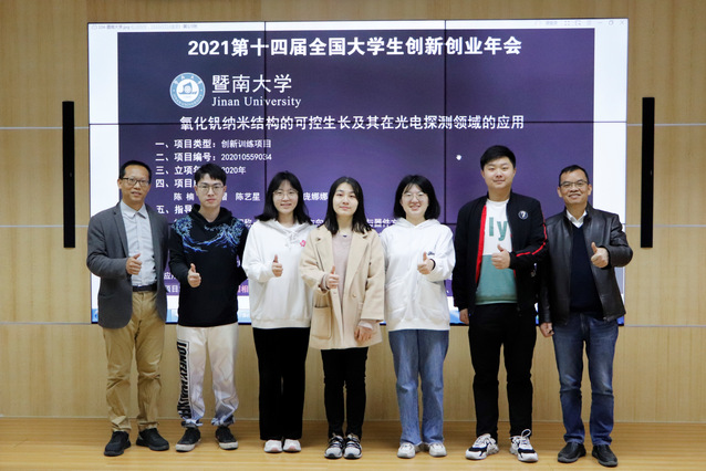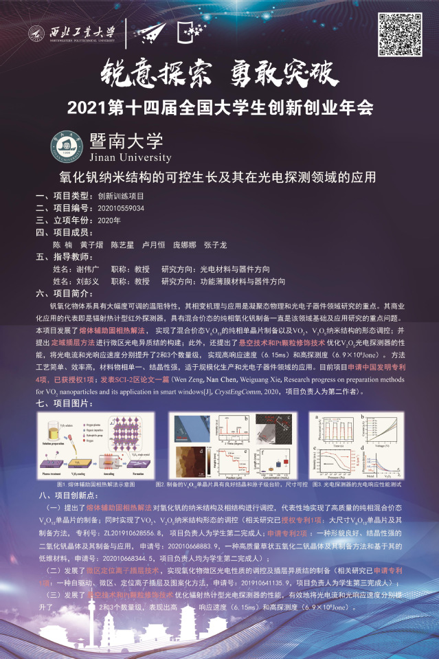 我院物理学系陈楠、黄子熠、陈艺星、卢月恒、庞娜娜、张子龙学生团队的参赛项目“氧化钒纳米结构的可控生长及其在光电探测领域的应用”在本次大创年会荣获“最佳创意项目奖”“最喜爱的项目奖”两项大奖。项目的指导老师谢伟广教授和刘彭义教授,他们同时获得“优秀指导教师”奖。