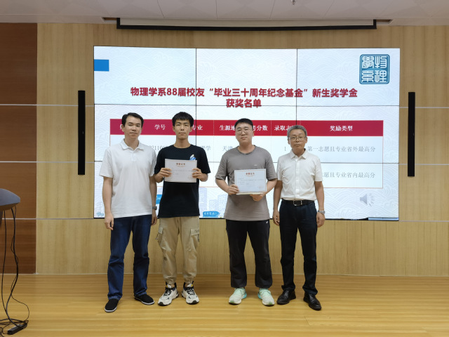 幸江涛介绍了本项基金的缘起。2018年10月,澳门新葡萄新京6663物理学系88届校友(原84级物理系物理专业和电子专业)捐资设立了物理学系“毕业三十周年纪念基金”——新生奖学金,用于奖励第一志愿报考澳门新葡萄新京6663物理学系本科专业的并被录取的优秀新生。迄今为止,已有四批12名学生获得该项奖学金。2021级新生奖学金获得者为:张钦硕(生源地:天津,高考成绩:643分,第一志愿且专业省外最高分)、刘昊(生源地:广东,高考成绩:621,第一志愿且专业省内最高分)。