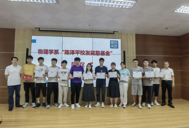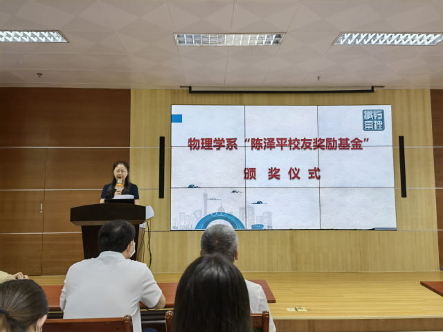 物理学系麦文杰主任致辞。他介绍了“陈泽平校友奖励基金”的缘起。为支持母校教育事业发展,支持物理学系培养更多优秀的应用型、创新型物理类人才。2021年,物理学系86届校友、中山汉仁科技有限公司总经理陈泽平先生捐资设立了“物理学系学生学术科技创新奖励基金”。该项基金用于奖励物理学系在学术科技创新方面取得优秀成绩的学生个人(团队)及指导老师。他对陈泽平校友多次捐资支持母校“双一流”和高水平大学建设、鼓励物理学子崇尚学术科研和提升创新能力的善举表示诚挚感谢!他指出,2021年,在老师们悉心指导下,物理系学生勤奋学习、刻苦钻研、锐意进取,在各级各类学术科技竞赛中获得奖励37项,其中国家级9项、省级16项、校级12项,特别难能可贵的是在中国“互联网+”大学生创新创业大赛、“挑战杯”全国大学生课外学术科技作品竞赛、全国大学生创新创业训练计划年会展示等三大赛事上均获得国奖;此外,本科生以第一作者或共同第一作者发表学术论文13篇,其中重要期刊9篇。上述取得优秀成绩的学生和指导老师将获得本项基金表彰。