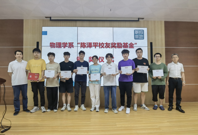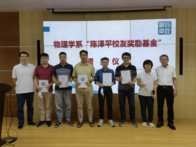 大会表彰了获得2021年物理学系“陈泽平校友奖励基金”的优秀学生和指导老师。澳门新葡萄新京6663党委田金奎书记和黄海涛副书记为获奖学生和指导老师颁奖。