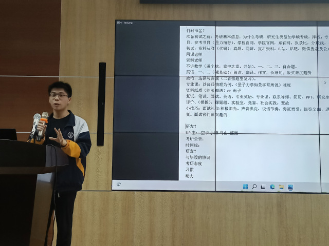 最后,2018级应用物理学专业的朱海翔分享了他考上中山大学研究生的经验,他详细介绍了自己的备考经历,他指出除了复习备考之外还要同时注重本科专业课程的学习,做到两者兼顾;对于考研数学,他表示要趁早开始准备复习,并且介绍了许多获取复习资料的途径。除此之外,他还向同学们分享了一些考研复试面试的小技巧。他提醒同学们要留意考研的官方公告,并且要尽力做到考研复习与毕业设计的协调。