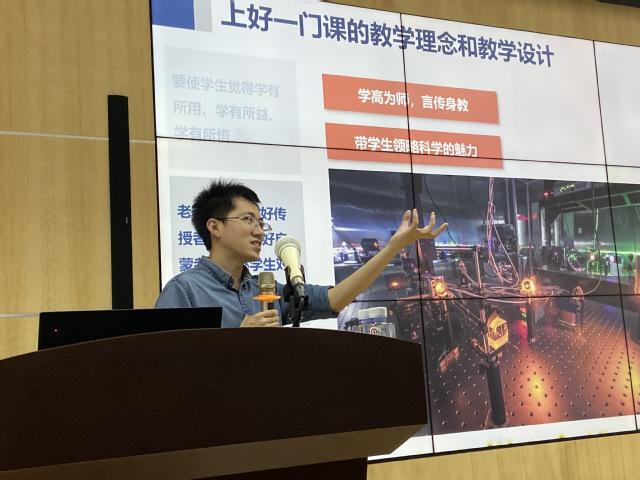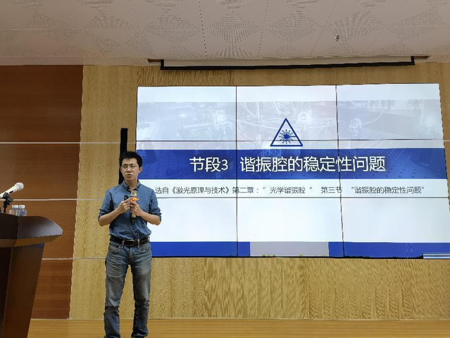 广东省青年教师教学竞赛一等奖及广东省高校教师教学创新大赛一等奖获得者朱思祁副研究员为现场的青年老师们展示了一堂20分钟的示范课。他选取自己参赛作品中的一个节段: 《谐振腔的稳定性问题》,通过课堂回顾、问题引入、重难点分析、课程总结,课后作业、相关科研成果展示等,将课程内容阐述得通俗易懂,同时将最新的教学理念、手段、方法、课程思政等充分融入到教学过程当中,展现了他非常扎实的教学基本功。