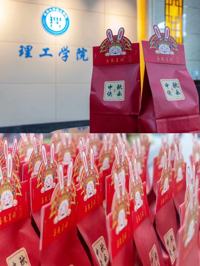 一袋袋月饼礼包整齐地摆放,印有理工院徽的精美卡套传递着“笃学精工”的理工精神。萌新们接到礼物后倍感惊喜,作为“理工人”的自豪感油然而生。