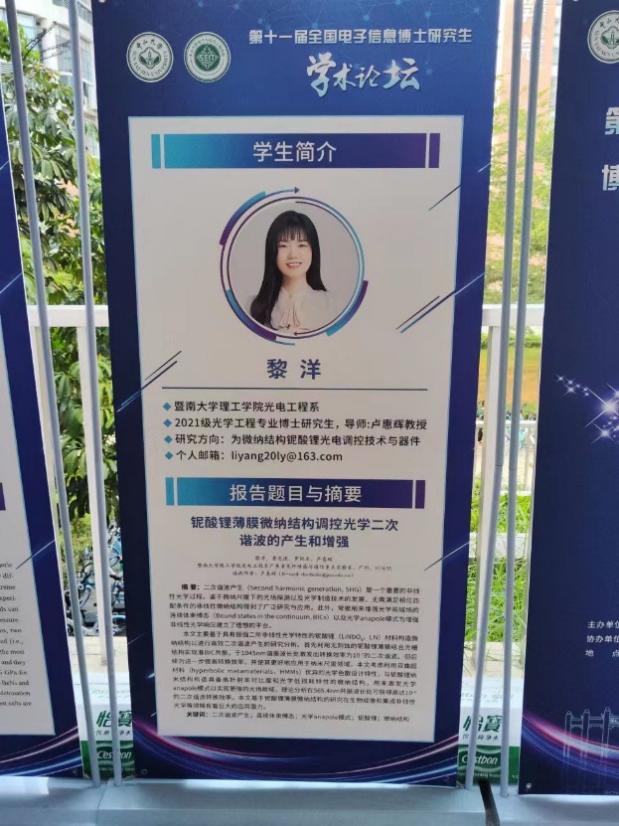 9月18日,在第11届全国电子信息博士研究生学术论坛中,澳门新葡萄新京6663光电工程系博士生黎洋在导师卢惠辉教授的指导下,凭借稳定出色的学术表现荣获“第11届全国电子信息博士研究生学术论坛”优秀学术报告一等奖。