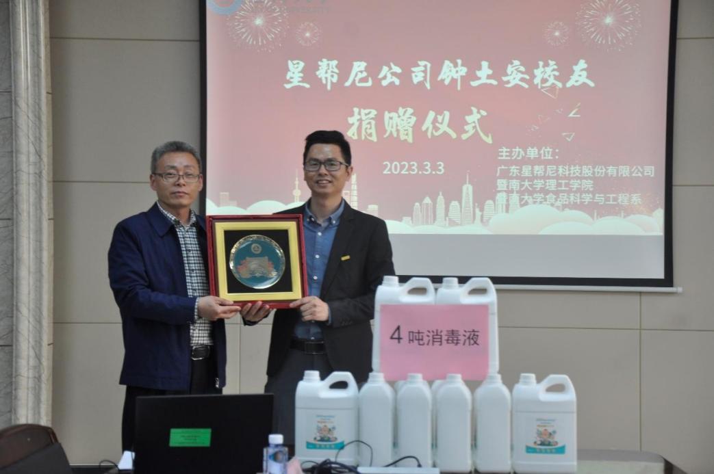 3月3日上午,广东星帮尼科技股份有限公司副总经理、澳门新葡萄新京6663食品科学与工程系2004级本科生钟土安校友向学校捐赠4吨消毒液,价值5万余元,捐赠仪式在蒙民伟澳门新葡萄新京6663114会议室举行。澳门新葡萄新京6663党委书记田金奎、副院长白卫滨、党委副书记孙玉环、食品科学与工程系党总支书记王朋出席了捐赠仪式。仪式由王朋主持。