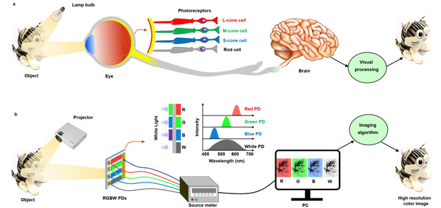 图1:人眼视觉细胞启发的钙钛矿彩色相机。(a) 由眼球和大脑组成的人眼视觉系统,特写了人眼视网膜中的负责彩色成像的红绿蓝视锥细胞和负责弱光轮廓感知的视杆细胞。(b) 本论文提出的钙钛矿彩色成像系统,其中红绿蓝白钙钛矿探测器分别用于模仿人眼的红绿蓝视锥细胞和视杆细胞。