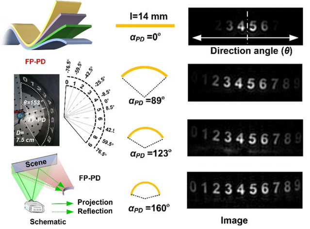 在2022年Adv. Mater.工作中,如图2所示,该团队将柔性钙钛矿光电探测器作为广角光收集器结合傅里叶单像素成像技术开发了一套视野角度可调的钙钛矿广角拍摄成像系统,其最大拍摄角度可超过150°,并且一定程度上抑制了桶型畸变问题。