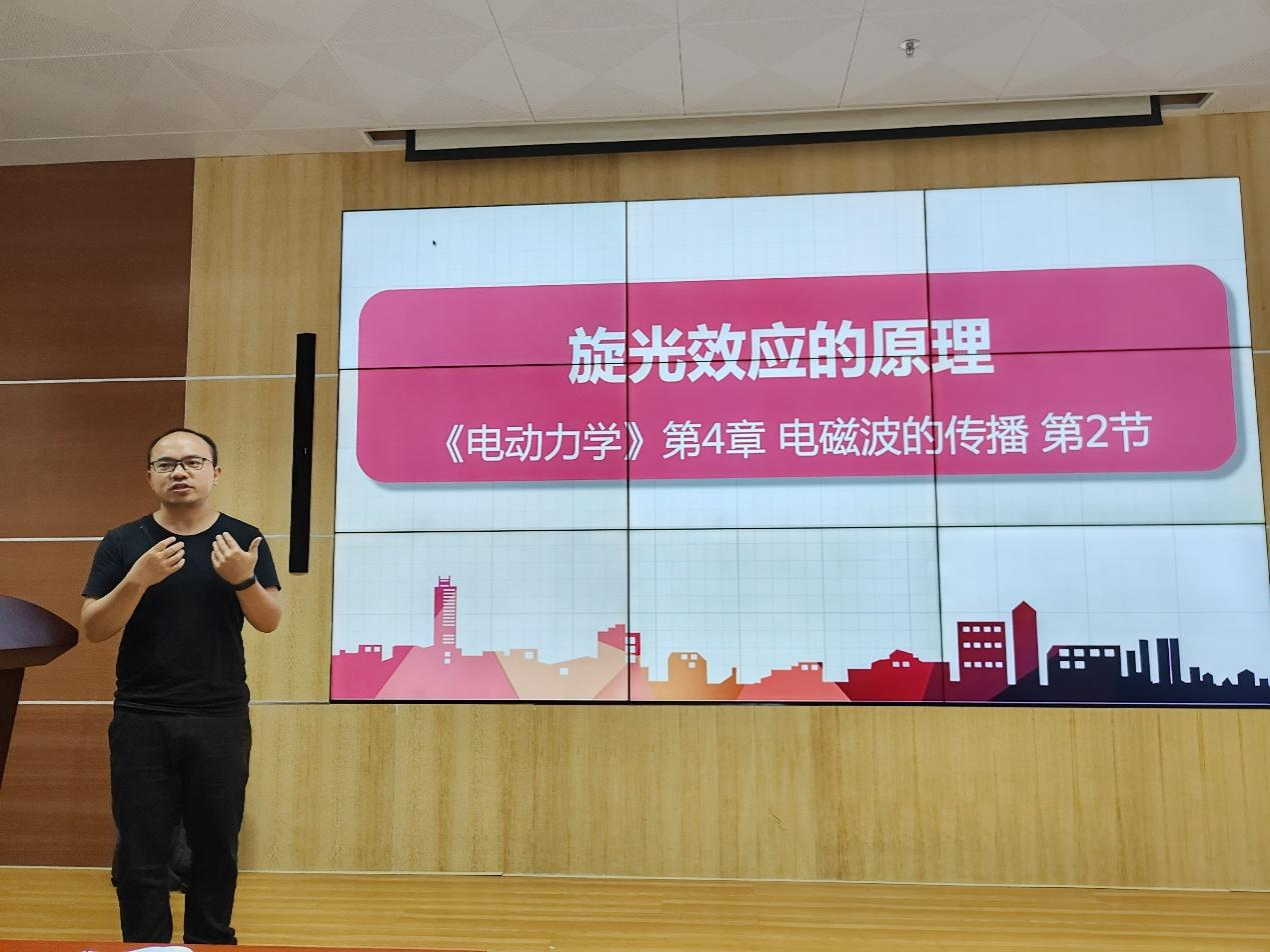 全国高校青年教师教学赛二等奖、广东省高校教师教学创新大赛特等奖、广东省本科高校课程思政教学大赛一等奖、广东省青年教师教学竞赛二等奖获得者刘鹏向青年老师们展示了一堂20分钟的示范课。刘鹏选取参赛课程《电动力学》的一个节段《旋光效应的原理》,通过课前预习、课堂互动、重难点分析、科研拓展、课程总结,课后作业等,将课程内容阐述得通俗易懂,同时将最新的教学理念、手段、方法、课程思政等充分融入到教学过程当中,展现了扎实的教学基本功及教学创新成果。