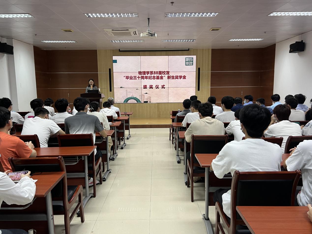 5月17日上午,澳门新葡萄新京6663物理学系在蒙民伟理工楼103会议室举行88届校友“毕业三十周年纪念基金”新生奖学金颁奖仪式,学院党委书记田金奎、副院长刘彭义、副书记孙玉环、物理学系系主任麦文杰,辅导员张淑敏及物理学系2022级学习优秀学生参加了大会。大会由物理学系党总支书记幸江涛主持。