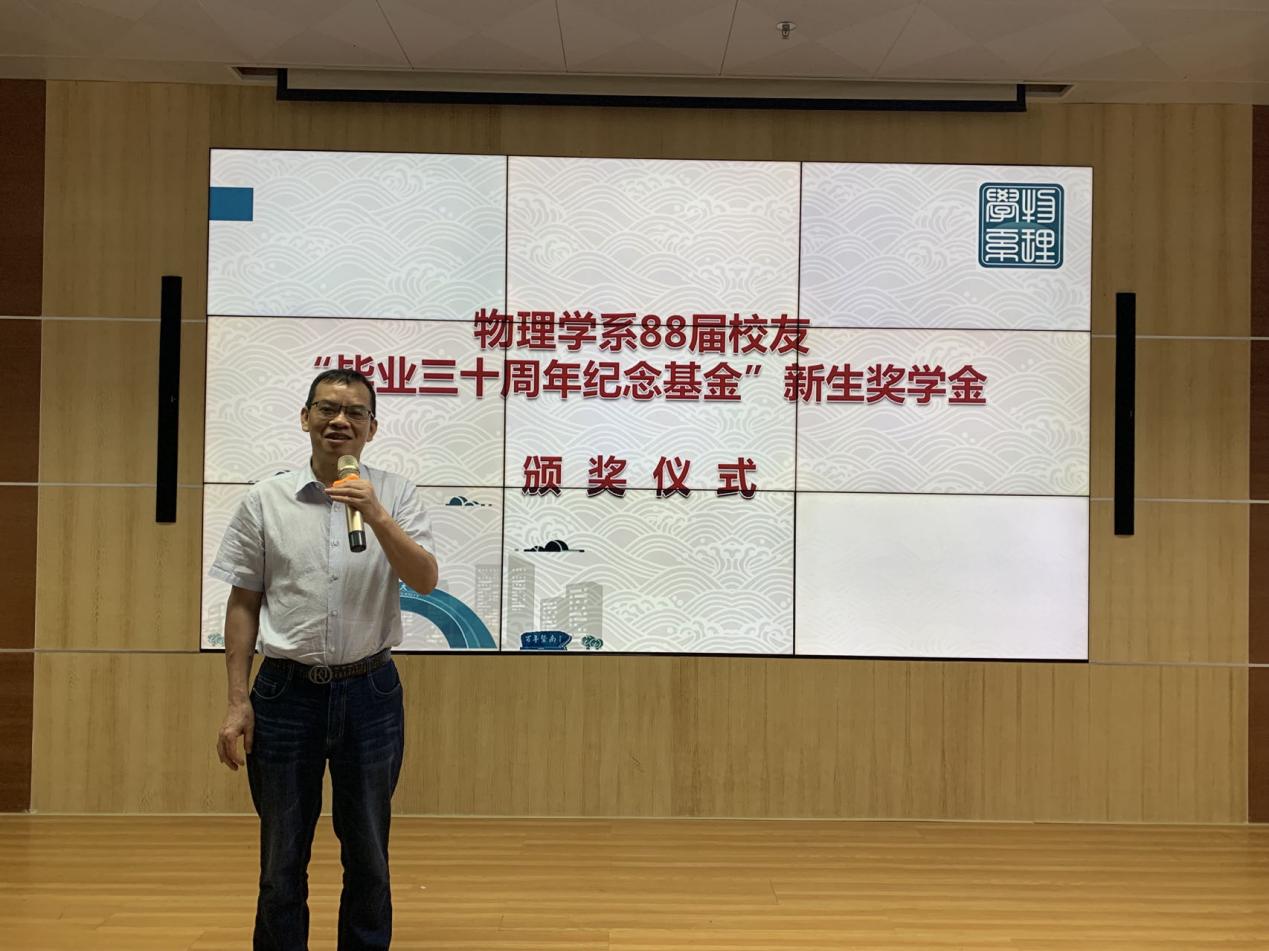 首先,刘彭义致辞。他介绍了本项基金的缘起,为支持学校教育事业发展、为社会培养更多的优秀人才,2018年10月,澳门新葡萄新京6663物理学系88届校友卢红民等人(原物理系84级物理专业和电子专业)捐资设立了物理学系“毕业三十周年纪念基金”——新生奖学金。该项基金用于奖励报考澳门新葡萄新京6663物理学系本科专业并被录取的优秀新生。迄今为止,已有5批14名学生获得该项奖学金。他感谢88届校友们对母校的深厚情义,赞扬他们关心母校的建设发展,以捐资方式鼎力支持澳门新葡萄新京6663、物理学系的学科建设和学生培养。