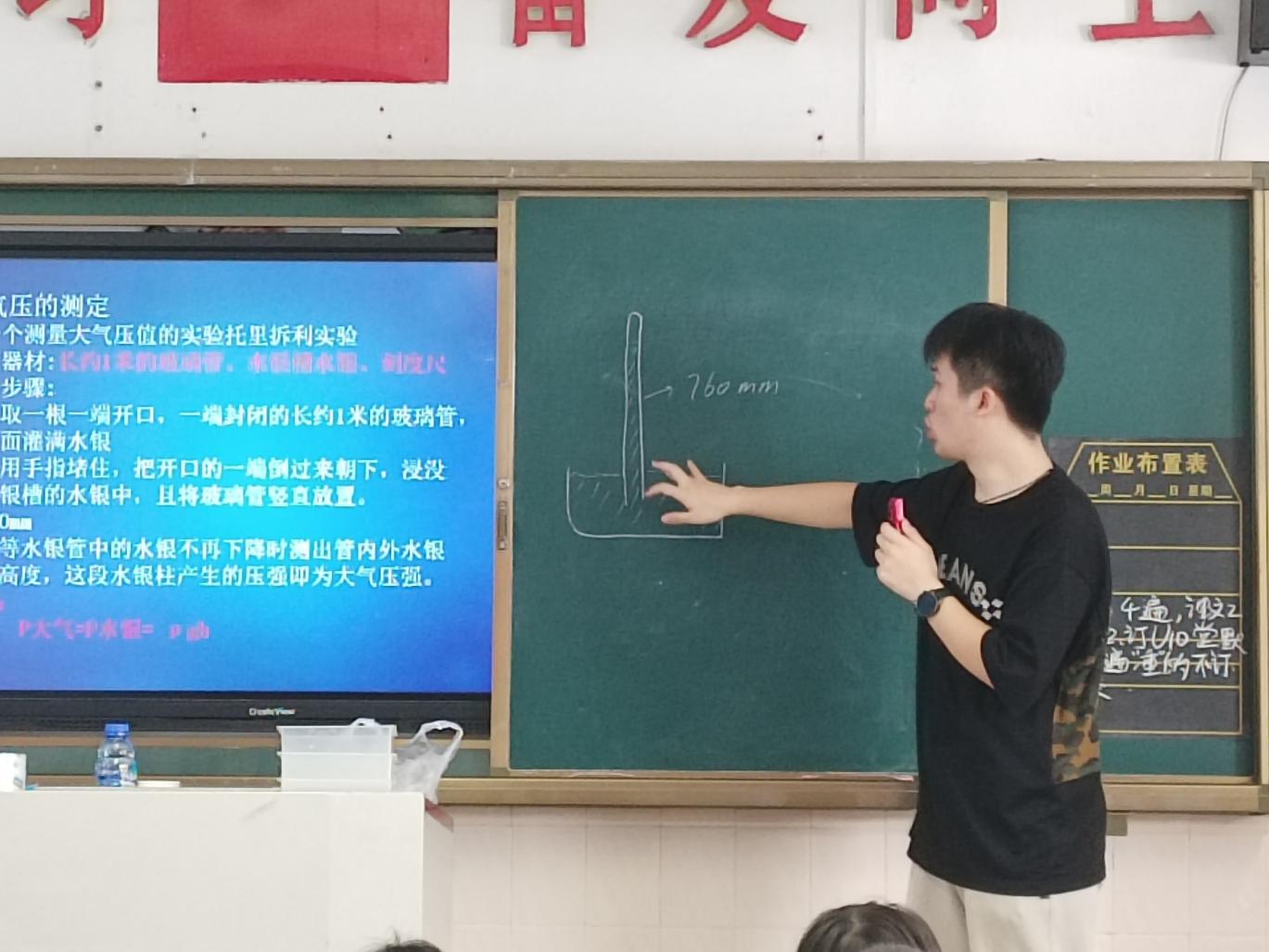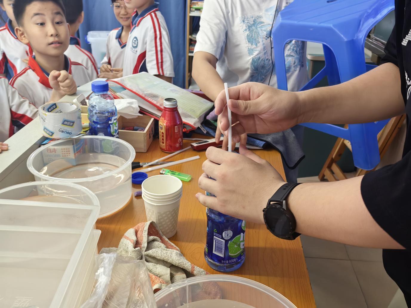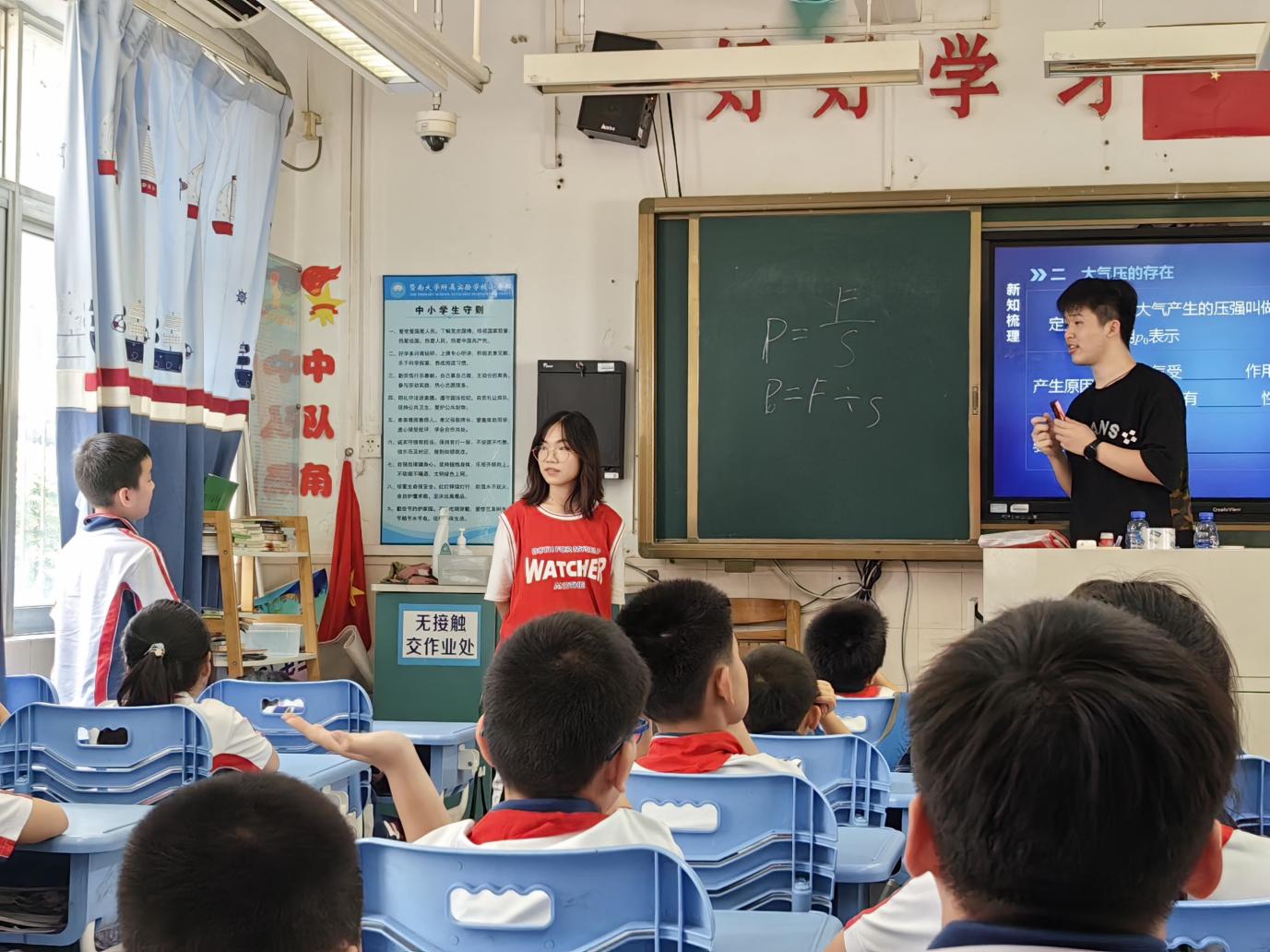 志愿者尹子舟和钟采霖为小学生们讲授了课程——大气压强,通过压力的概念引入课程的内容,用提问的方式开拓了思路,并带领同学们动手完成两个有趣的实验。