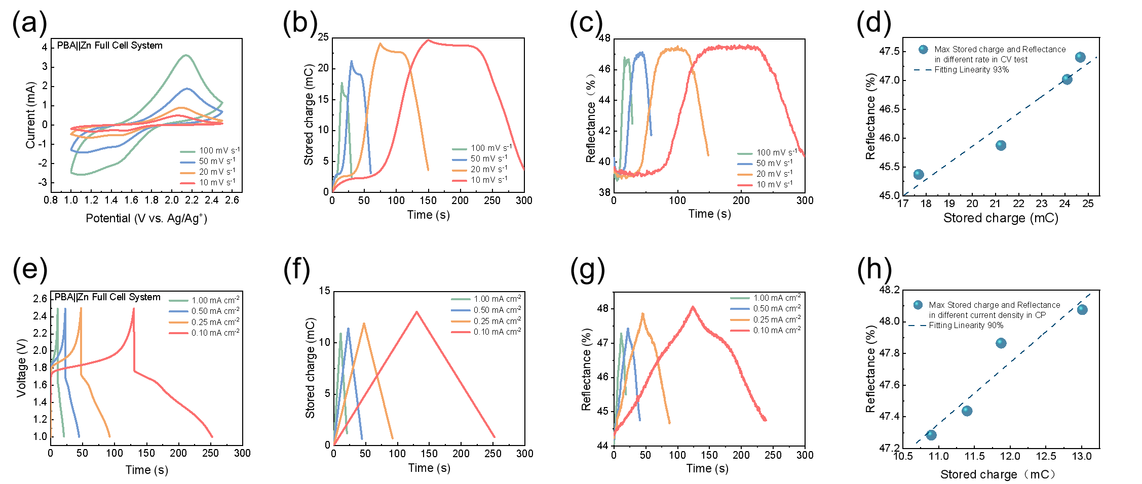 通过记录光学照片并进行图像重构获得电极反射率的物理时域光谱图,可以有效追踪锌离子电池中的离子存储行为及普鲁士蓝类似物正极的物相转变情况。同时,该新型光学技术还可以监测器件的实时荷电状态,其重构光学信号强度与电荷存储量呈现较高的线性拟合度(>98%)。