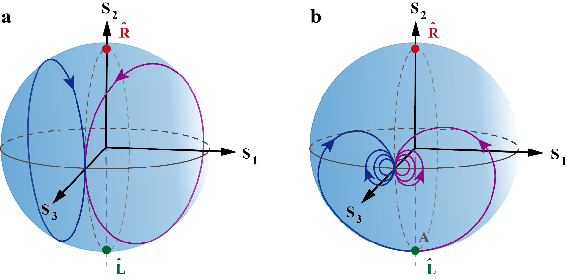 在现有研究工作中,拉比振荡只涉及两种独立的振荡形式:自旋态振荡和轨道态振荡。如何在高阶物理体系实现自旋-轨道耦合的拉比振荡?针对这一基本问题,该光场调控科研团队通过类比量子力学自旋1/2系统(如图1a),利用左、右旋圆偏振涡旋光场构建高阶光学体系的赝自旋1/2系统(如图1b),并导出相应的等效磁场模型。在等效磁场的作用下,高阶赝自旋态(结构光场模式)在两“能级”间发生周期性振荡。研究人员首次在理论和实验上同时展示了自旋-轨道耦合的拉比振荡行为。