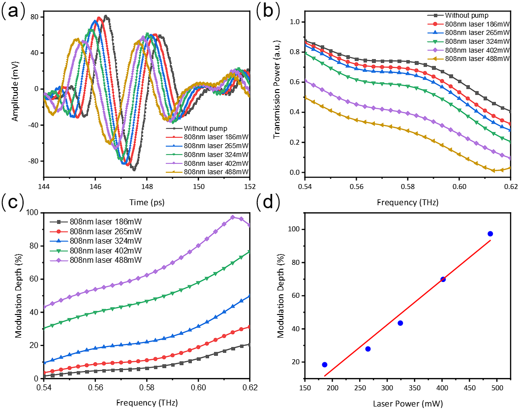 在外置808 nm激光器的作用下,实验结果如图2所示。从图2(a)和(b)中可以看出,随着外置808 nm激光器的功率增强,时域谱和频域谱的强度出现明显下降,波峰位置也发生左移。在808 nm泵浦光的作用下,光子能量与砷化镓的带隙能量相匹配,吸收一定能量的光子后有效的激发电子从价带跃迁到导带从而形成自由载流子,然后这些载流子会以扩散形式传递。随着激光功率的不断增加,当光掺杂浓度越高的时候,载流子数量越多,导致透射就越低。通过计算得到调制深度谱图2(c),当外置激光功率为488 mW时,在0.61 THz处调制深度达到97.4%,带宽为0.08 THz,拟合出的调制深度随激光功率的变化相关系数R2为0.96,从而实现高调制深度的太赫兹调制器。