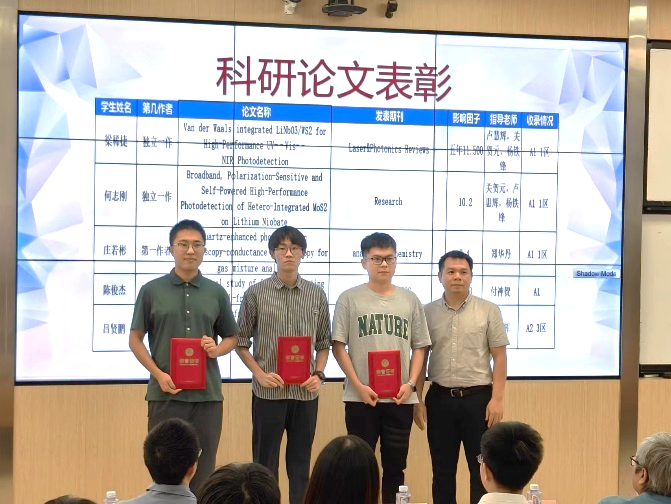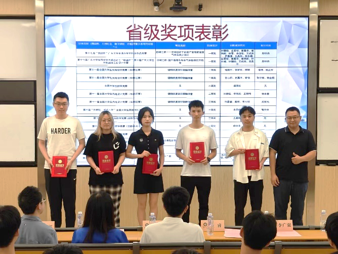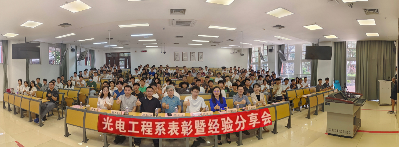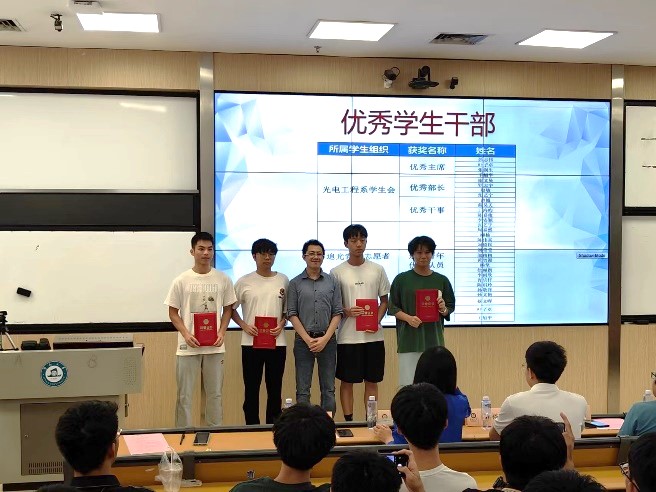 11月6日,物理与光电工程学院光电工程系2022-2023学年表彰大会在富力教学楼124课室召开。本次大会为荣获国家级和省部级等各类奖项、荣誉称号,以及在科研论文发表等方面表现突出的学生代表们颁奖。学院党委书记黄睿、广东九安智能科技股份有限公司智能嵌入式开发经理李广强校友及无线技术经理韩裕校友、光电工程系主任卢惠辉、党总支书记曾庆慧、副系主任朱思祁、辅导员李仕萍、马悦及全体2023级新生参加大会。会议由马悦主持,广东九安智能科技股份有限公司提供赞助。
