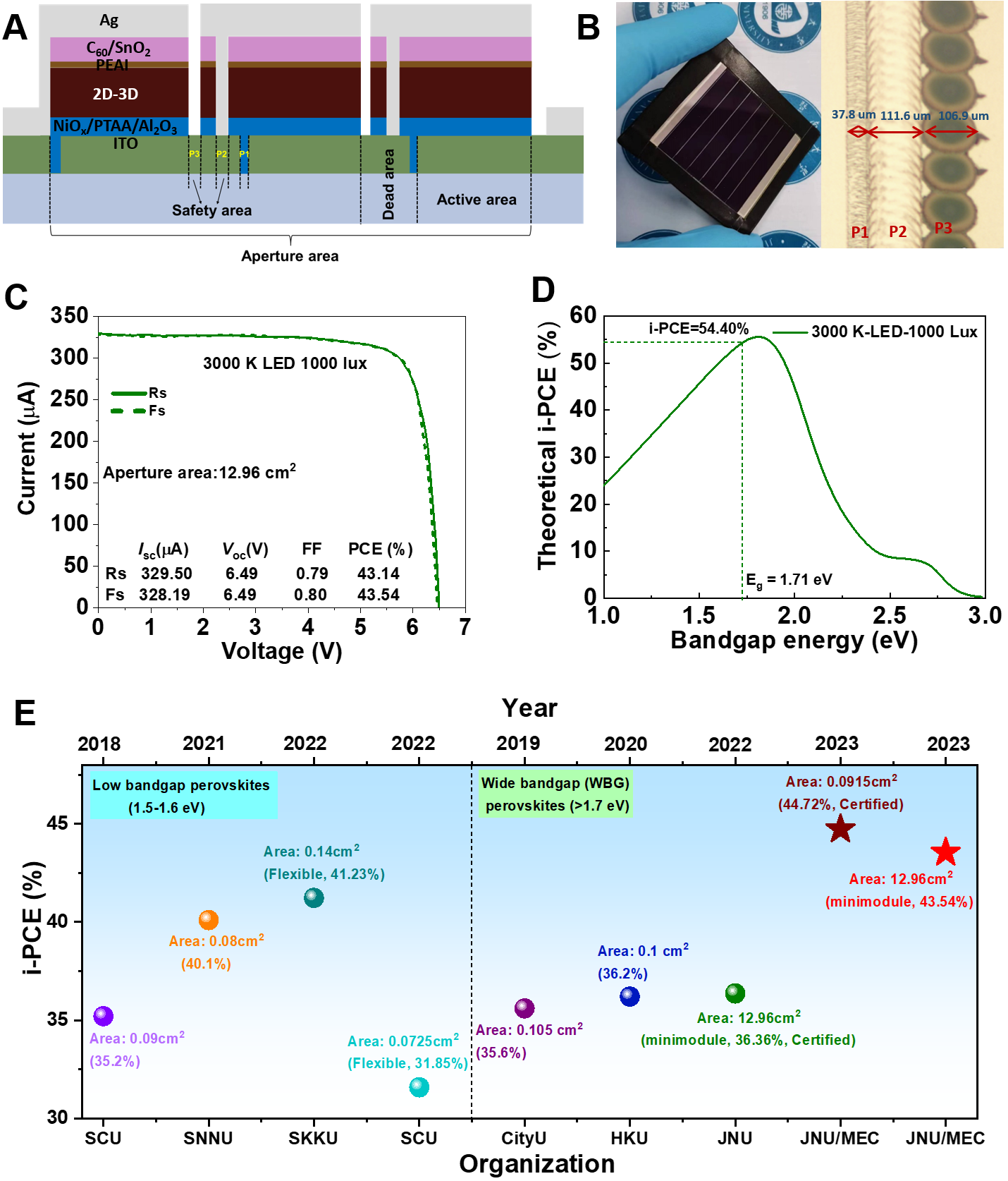 图1.为宽带隙钙钛矿太阳能电池组件及室内光伏性能。