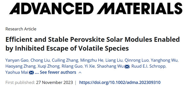 物理与光电工程学院新能源技术研究院麦耀华/吴绍航课题组在新能源领域取得重大进展,并于近日在世界知名期刊Advanced Materials(影响因子:29.4)上发表题为“Efficient and stable perovskite solar modules enabled by inhibited escape of volatile species”的最新研究成果。新能源技术研究院麦耀华教授和吴绍航副研究员为共同通讯作者,高彦艳博士与刘冲副研究员为共同一作,澳门新葡萄新京app官网为第一且唯一的通讯单位。