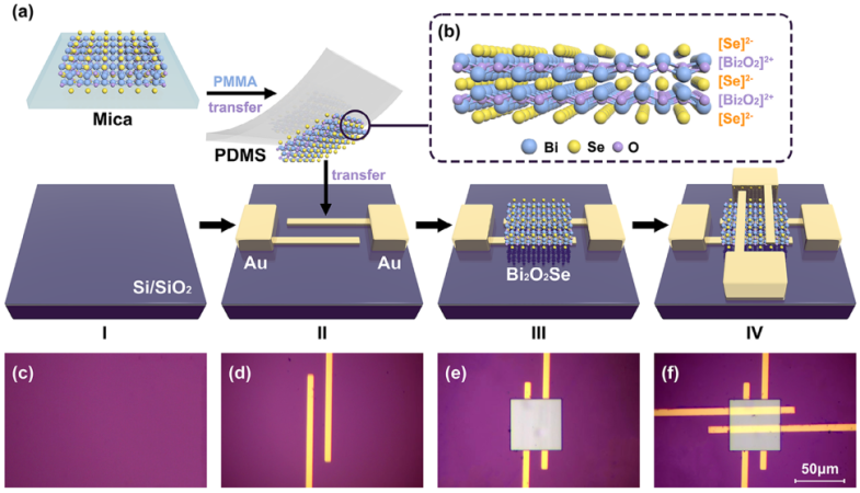 研究进展:该团队提出一种双交叉的器件结构,通过定点光刻套刻的方式在二维Bi2O2Se半导体的上下表面分别加工出两套垂直放置的电极,构建了类似三明治的结构,因此基于同一个Bi2O2Se纳米片获得了高度紧凑的三合一器件,即底面水平(BSH),中间夹层垂直(MSV)和顶面水平(TSH)的器件。水平配置的器件(BSH和TSH)受限于光刻加工精度的限制,沟道尺寸保持在微米尺度,而垂直配置的器件(MSV)沟道尺寸则由二维Bi2O2Se纳米片的厚度决定,可以轻松突破瑞利判据决定的加工精度到达纳米尺度。此外,一般器件的构筑都是将半导体材料放置在一块衬底上,然后通过微纳加工技术获得器件,前人的研究也发现衬底对器件性能的影响同样重要;同时,作为光探测器件来说,通常外部的刺激(如光照)从器件的顶端施加,所以器件的上表面相比下表面更早接收刺激产生反馈。在此工作中,半导体沟道上下表面的电信号可以分别由两套电极收集导出,因此双交叉结构的使用,赋予了该研究团队可以在同一个纳米片上,系统对比上下表面的器件行为,以及对比水平微米沟道和垂直纳米沟道的光电响应特性。
