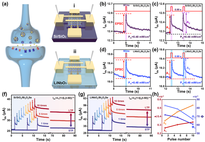 研究结果表明,具有纳米级沟道的MSV器件具有更高效的光生电子和空穴对的分离和短沟道传输的优势,因而对光刺激的响应更快,与BSH和TSH器件相比更有优势。由于BSH器件与衬底的接触更紧密,BSH器件的光电行为可以通过衬底的特性来调节。特别地,TSH器件的性能对外部环境更敏感,以及Bi2O2Se自身低热导率和辐射热效应的存在使得该器件对外部光照变化体现出非易失特性,进一步地通过施加光脉冲测试发现,TSH器件可以用于模拟人脑的神经元突触的工作原理,作为人工光电突触器件,可以模仿人类学习过程的记忆与遗忘过程。