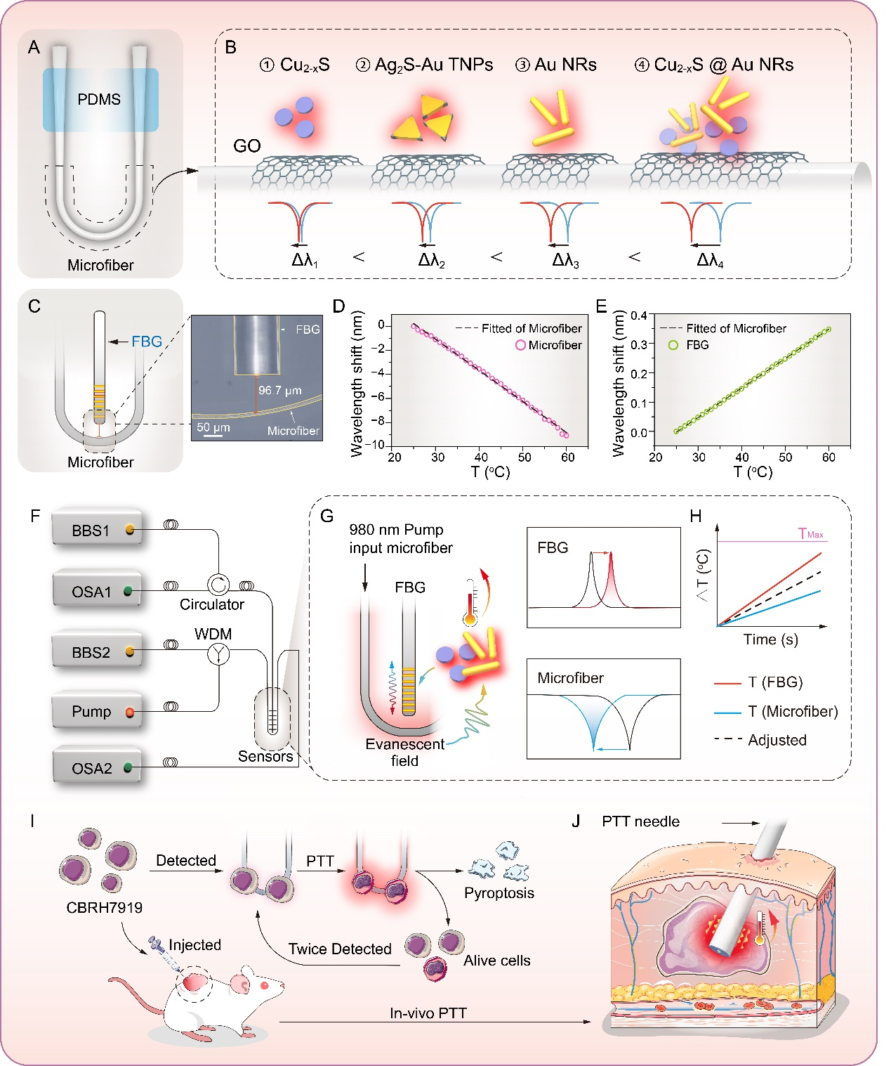 光纤提供了解决上述问题的可能性。光纤作为生物传感器已广泛应用于疾病标志物检测领域。而在光热治疗领域,光纤可以在体内作为光引导介质,从而大大减少光在组织中的散射和吸收,克服光穿透深度有限的障碍;光热剂也可以集成在光纤表面,以解决光热剂在正常组织的积累和伤害问题。在前期工作的基础上,关柏鸥教授、黄赟赟研究员团队提出了一种通过界面设计将光纤和光热剂相结合的设计理念,实现了集癌症检测和治疗功能于一体的光热诊疗纤维。该纤维由金纳米棒和硫化铜双等离子体纳米界面和微纳光纤组成,双等离子界面通过局域表面等离子共振效应增强光纤倏逝场,从而提升传感器灵敏度,同时,界面具有较高的光热转化效率(78.9%),可以利用很低的泵浦功率对传感器界面温度进行自由调节,用于自热检测和肿瘤消融。利用双等离子界面的增敏效应和光热效应,并在界面上组装识别分子层,可用于区分癌细胞和正常细胞,量化癌细胞,对癌细胞进行超热消融,并评估消融效果。该传感器作为治疗深部肿瘤的独特工具具有很大的前景,并为探索紧凑的光治疗设备提供了有前途的策略。双等离子体纳米界面和微纳光纤的结合代表了一种新的光热治疗概念,具有克服有限的光穿透深度和光敏剂非特异性积累以及对正常组织的意外伤害的潜力。该器件有望实现癌症诊断、治疗和术后监测的同步进行,加快智能治疗的开发和临床转化。