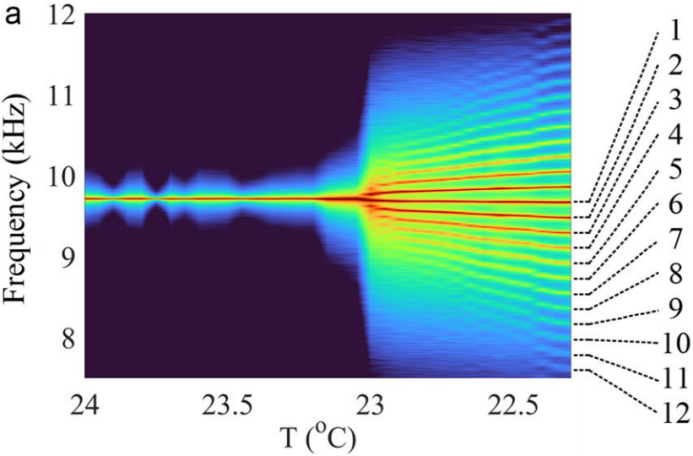 传统非厄米物理中,奇异点(EP)尤其是高阶 EP的分叉现象,可以放大传感灵敏度,是近期计量学的研究热点。但是,这种方法的高灵敏度以系统的鲁棒性为代价。为了突破该约束,团队成员转变研究思路,在电学微腔体系引入了四波混频式非线性,实验观察到六阶非线性诱导的低阶EP的四波混频式分岔。这一新现象将传统EP分叉获得的灵敏度放大了十一倍,同时保持了系统的自由度,不再以系统的鲁棒性为代价。此外,由于非线性效应,研究还发现EP附近存在混沌动力学,这与随机噪声线性状态下的EP简并提升存在明显差异。研究将EP简并提升的范围扩展到非线性,为新一代可穿戴民用、单兵电子装备提供了关键器件。