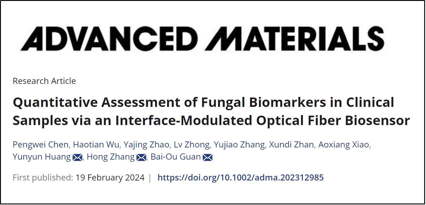 澳门新葡萄新京app官网物理与光电工程学院关柏鸥教授团队与澳门新葡萄新京app官网附属第一医院张宏教授团队合作,在国际著名期刊Advanced Materials上发表题为“Quantitative Assessment of Fungal Biomarkers in Clinical Samples via an Interface-Modulated Optical Fiber Biosensor”的最新研究成果,关柏鸥教授、张宏教授和黄赟赟教授为共同通讯作者,澳门新葡萄新京app官网博士后陈鹏伟、博士生吴昊天、博士后赵亚婧为论文的共同第一作者,该工作由澳门新葡萄新京app官网独立完成。