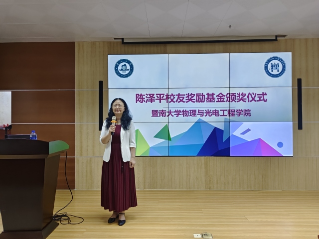 黄睿致辞。他介绍了“陈泽平校友奖励基金”的缘起。2021年,物理学系86届校友、中山汉仁科技有限公司总经理陈泽平先生设立了“澳门新葡萄新京app官网物理学系学生学术科技创新奖励基金”,以支持学校教育事业发展,支持物理学系培养更多优秀的应用型、创新型物理类人才。该项基金具体用于奖励物理学系在学术科技创新方面取得优秀成绩的学生个人(团队)及指导老师。至2024年,陈泽平校友向该基金累计捐资24万元。他指出陈泽平校友一直心系母校建设,与物理学系共建了物理创新人才培养基地,长期积极为物理学系学生的实习实践提供平台。此外,陈泽平校友积极捐资支持母校的教育事业,曾于暨大110周年华诞期间,捐赠人民币30万元设立澳门新葡萄新京6663(物理与光电工程学院前身)学生创新创业基金;同时,与86届校友一起为番禺校区校园捐赠价值人民币40万元的名贵树木建成感恩林。他感谢并赞扬陈泽平校友回馈母校、关心和支持物理学子成长成才的情怀。