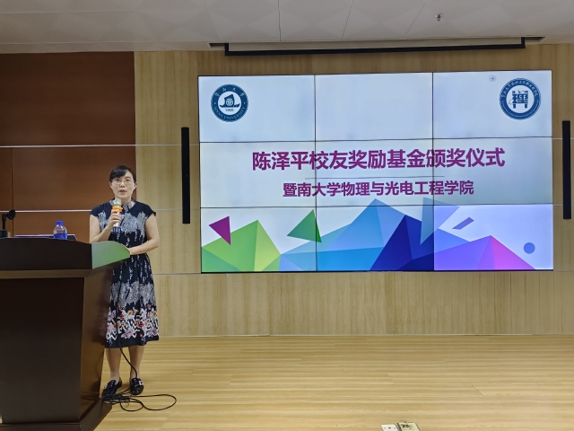 幸江涛宣读了“陈泽平校友奖励基金”2023年表彰名单。她感谢陈泽平校友给予物理学系学生在创新创业方面的大力支持!她指出,2023年,物理学系本科生勤奋向上、刻苦学习、潜心钻研、锐意进取,在各级各类学术科技竞赛中获得奖励15项,其中国家级4项、省级6项、校级5项;本科生以第一作者或共同第一作者发表学术论文10篇,其中核心期刊6篇。特别值得称赞的是在“挑战杯”国赛上取得突破,获得了一等奖;至此,已连续两届在“挑战杯”国赛上获奖,连续三届在大创年会上获奖。三年来,物理学系学生在“互联网+”、挑战杯、大创年会三大重要赛事上均获得了国奖!