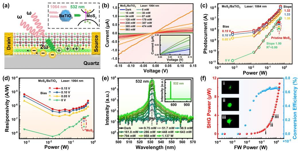 图2. MoS2/BaTiO3器件的非线性上转换光探测特性