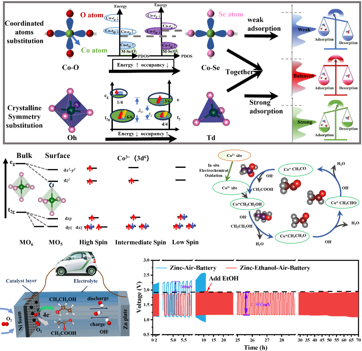基于所合成的催化剂在EOR中优越的电化学性能表现,采用EOR替代OER的创新策略,设计了一种新型的混合电解水及锌醇空气电池体系。在混合电解水中,电压在50 mA/cm2时相比传统电解水负移190 mV,同时,在锌醇空气电池中,充电所需电压降低,在相同电流密度下充电所需的电压比传统锌空气电池降低了360 mV以上,循环稳定性大大提高,这是由于避免了充电过程氧气释放对电极材料的破坏。该工作发现调整材料的dz2+dx2-y2轨道填充能够优化其反应中间体吸脱附能力,进而影响其催化活性,这一思路有望将其应用于其他催化剂材料中并推广到其它各类小分子有机物氧化,为新型混合电解水和锌醇空气电池的开发提供了具有前景的催化剂设计策略。