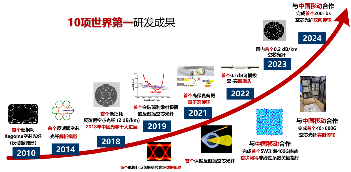 反谐振空芯光纤技术发展的20年历程中,澳门新葡萄新京app官网物理与光电工程学院(澳门新葡萄新京6663)微结构光纤团队长期深耕于技术最前沿,做出了基础性核心贡献。2010年,汪滢莹在英国巴斯大学读博期间研制出世界首个内凹纤芯空芯光纤,将反谐振型空芯光纤传输损耗纪录降低一个数量级(Opt. Lett. 36, 669),并开启了全球反谐振空芯光纤的研究热潮;2014年,丁伟完成首个降损机制的理论阐述(Opt. Ex, 22, 24697);2018年汪滢莹、高寿飞等人研制出世界首个连体型反谐振空芯光纤,将损耗纪录再降一个数量级(Nat. Commun. 9,2828); 2019年丁伟联合北工大、物理所、北大团队完成国内首个低损耗反谐振空芯光纤通信实验(OFC 2019, M3C.6); 2022年丁伟实现世界首个0.1dB可插拔空芯-实芯连接头(Opt. Ex, 30, 15149); 2023年汪滢莹、高寿飞实现0.2dB/km的传输损耗(ECOC 2023, Tu.C.4.2)。凭借深厚的专业积淀与丰富的实战经验,团队屡次攻克技术难关,勇创空芯光纤领域10项世界纪录。