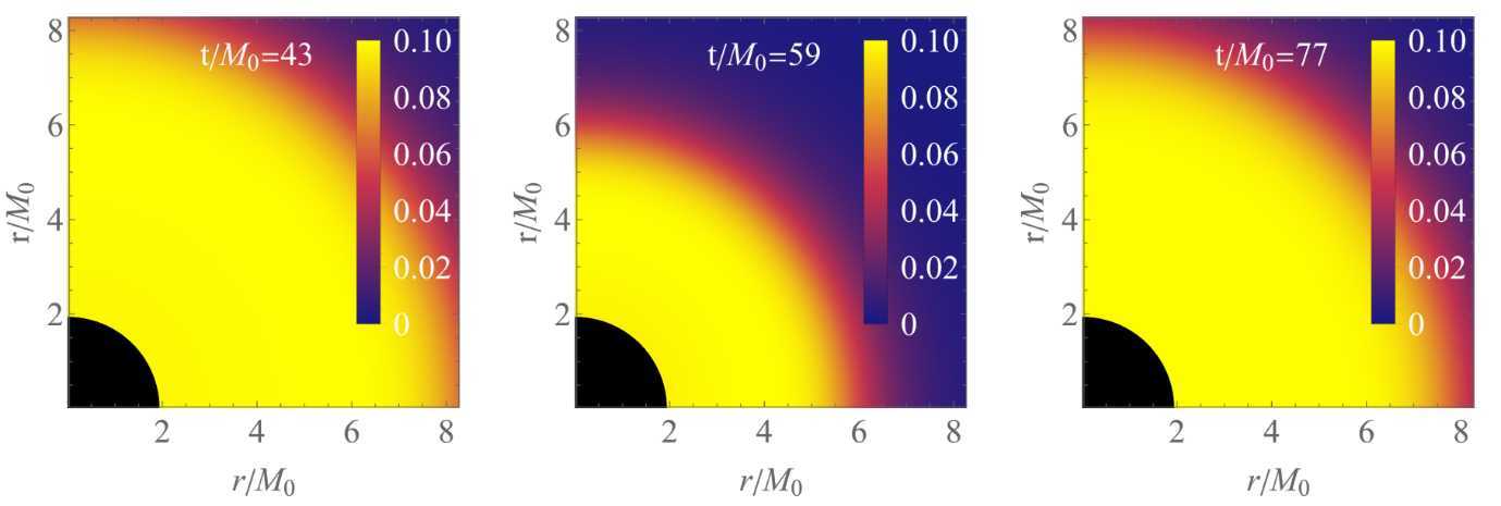 图2.演化过程中, 黑洞毛的周期性径向膨胀和收缩