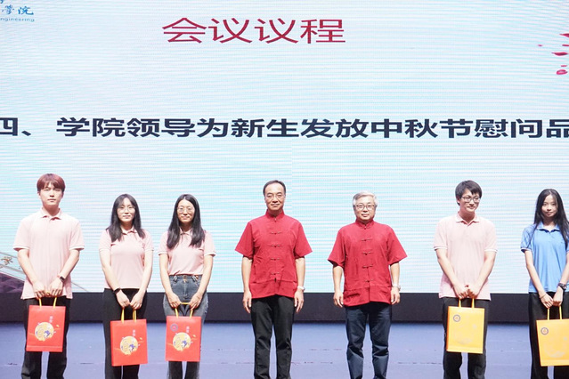 院长关柏鸥、党委书记黄睿为新生发放中秋慰问品