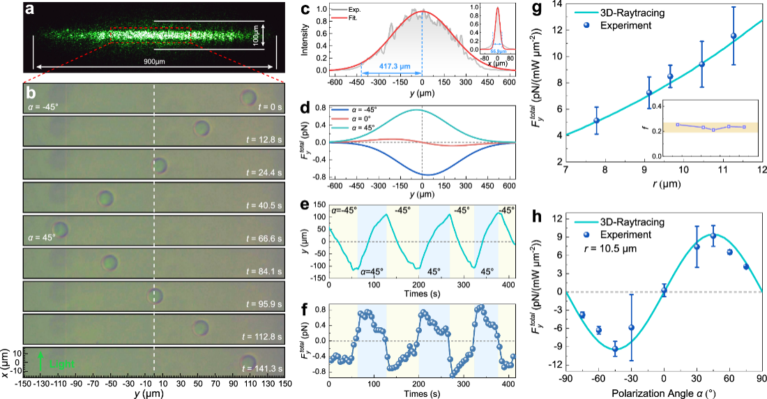 研究人员通过实验观察了半漂浮在空气-水界面上的十二烷油滴的动态作用,证实了LOF对偏振角具有正弦依赖性,并且实现了9.22 N/mW/μm−2的LOF效率,比目前相关研究报道的LOF效率至少高出两个数量级,如图2所示。