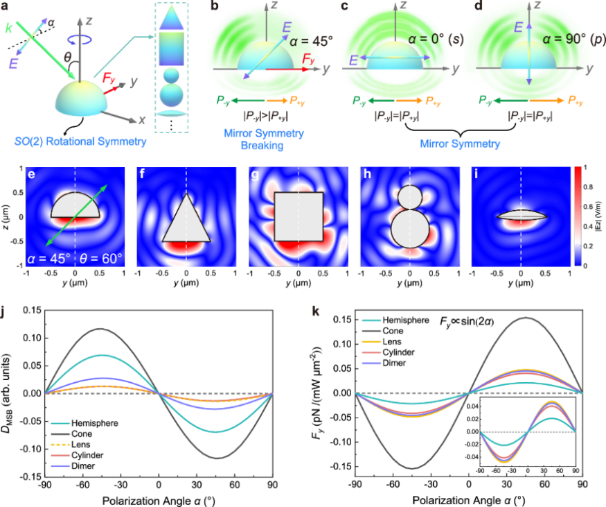 研究团队展示了一种在SO(2)旋转对称系统中普遍存在的动力学作用,机制示意图如图1所示。理论结果表明,这种新型MSB机制可以普遍应用于SO(2)旋转对称系统,并通过偏振取向进行正弦调控,从而产生垂直于传播方向的极易调谐和高效的LOF。重要的是,这种MSB机制和LOF仅依赖于入射光偏振和入射角,不需要复杂的结构光、基底和特殊的手性材料。