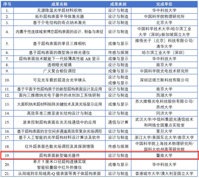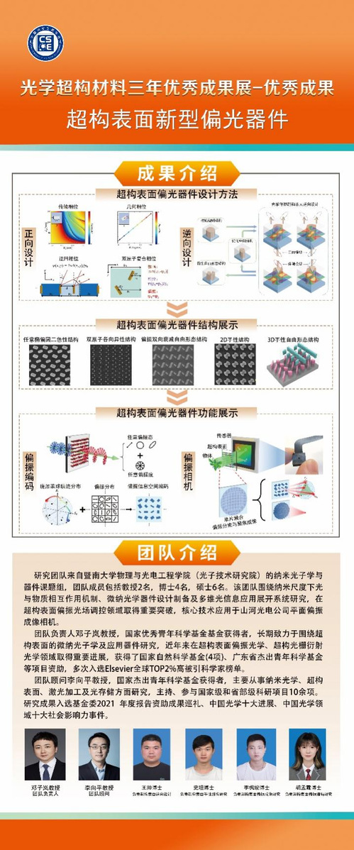 9月7日-9日,中国光学工程学会公布“光学超构材料三年优秀成果展”入选名单。物理与光电工程学院(澳门新葡萄新京6663)光子技术研究院超构表面微纳光子器件课题组(邓子岚、李向平、王帅、史坦、李枫竣、胡孟霞)的系列成果——超构表面新型偏光器件,被评为“设计与制造类”优秀成果,充分展现了团队在微纳光学领域的创新能力与技术突破。
