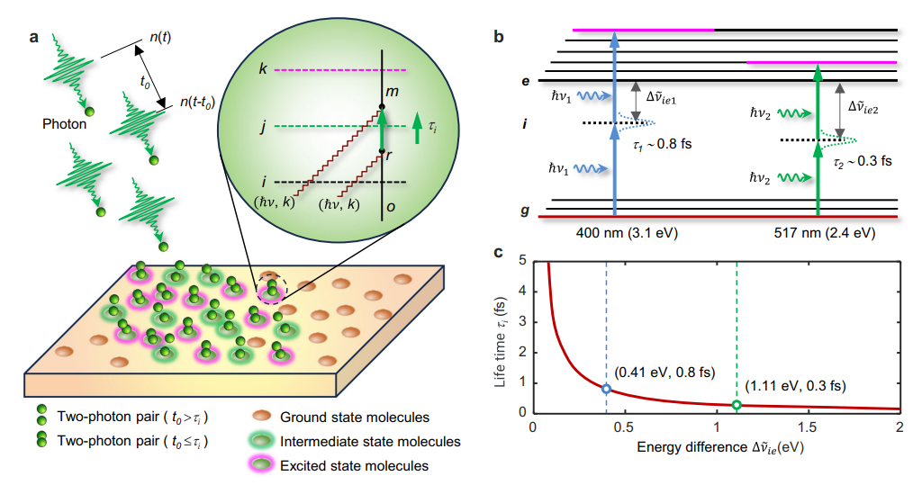 双光子吸收(TPA)是一种广泛应用于三维荧光成像和纳米结构加工领域的非线性光学现象。传统的TPA技术使用高强度聚焦激光束激发荧光分子实现三维荧光成像,或诱发局域化学交联反应实现三维纳米加工。然而,高强度聚焦激光束不仅会引发不必要的高阶非线性光学效应,导致光毒性、光漂白和微爆炸等问题,还会限制其分辨率和效率提升。针对现有基于波动光学理论的双光子效应研究范式,研究团队从量子理论基本原理出发,利用波粒二象性、叠加态、不确定性原理、随机概率统计等光量子特性构筑了双光子吸收过程的量子图像,建立了少光子辐照下的双光子吸收时空量子模型,阐明了双光子吸收的时间依存量子机制。模拟计算结果表明,在高度聚焦的少光子飞秒激光脉冲辐照下,双光子吸收概率呈现出与传统高斯分布完全不同的分布状态,其半高全宽被压缩至数纳米,证明了利用双光子吸收量子机制突破传统波动光学理论衍射极限的可行性。