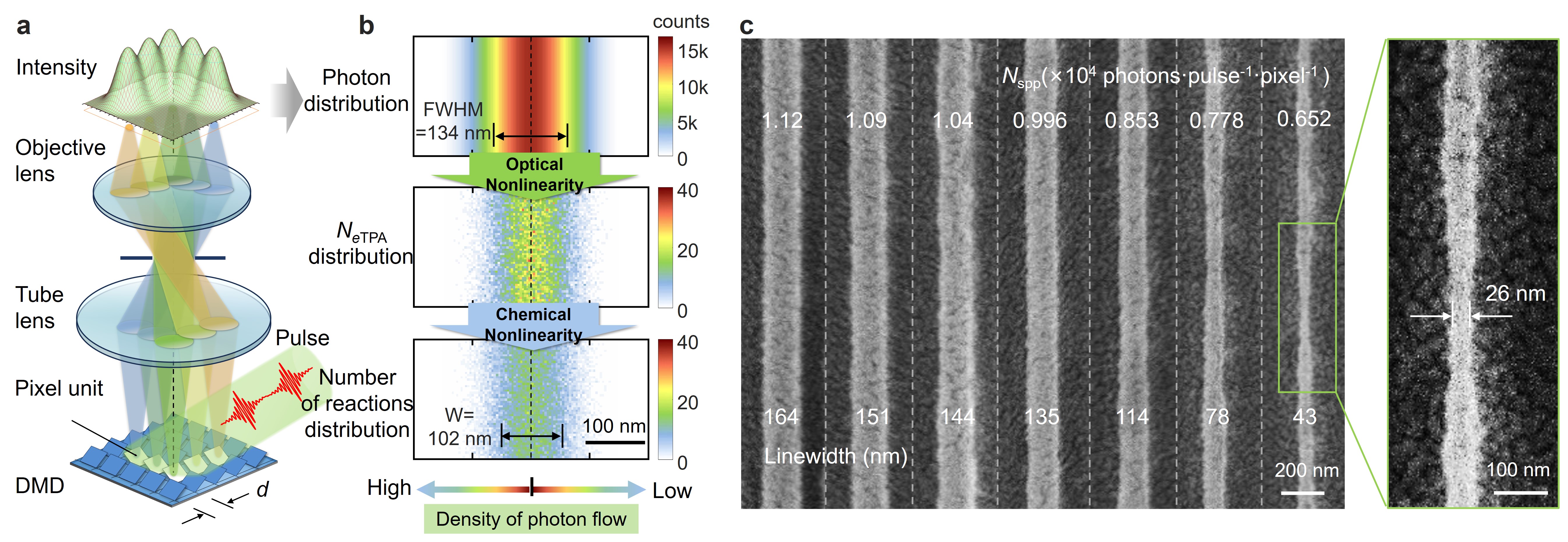 运用双光子吸收量子机制,研究团队提出了一种全新的“少光子辐照双光子吸收”(fpTPA)技术方案,研制了双光子数字光学投影光刻(TPDOPL)实验系统,开展了双光子吸收量子机制验证与应用探索。该系统利用数字微镜器件(DMD)作为数字掩膜,能够灵活地将飞秒脉冲激光生成任意图案,将其投影到光刻胶上实现纳米光刻。通过精确控制光子通量和脉冲累积次数,研究团队成功实现了26纳米的最小特征尺寸,这一尺寸仅为波长的二十分之一,远低于传统光学曝光技术的分辨率极限。与传统的逐点激光直写技术相比,TPDOPL技术的吞吐量提高了几个数量级,能够在短时间内实现大面积的纳米结构制造。此外,研究团队还提出了一种原位多次曝光技术(iDME),通过在DMD上加载多个图案并进行交替曝光,能够在不违反光学衍射极限的情况下实现高密度图案的制造。例如,通过两次交替曝光,研究团队成功制造了周期为210纳米(相当于波长的0.41倍)的密集线阵列,这一周期远低于传统光学曝光技术能够达到的极限。