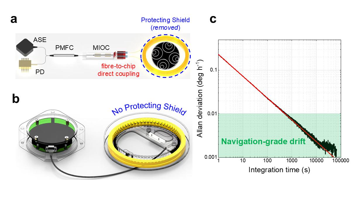 近日,澳门新葡萄新京app官网物理与光电工程学院(澳门新葡萄新京6663)丁伟研究员、汪滢莹研究员团队与中国船舶集团第七〇七研究所赵小明研究员、罗巍研究员、李茂春研究员团队展开深度合作,在高精度空芯光纤陀螺(Air-core FOG)领域取得重大进展。研究团队成功研制出全球首个导航级精度空芯光纤陀螺,其零偏不稳定性达到0.0017°/h,较现有记录提升了近30倍,样机连续稳定运行超185小时。相关成果以“Navigation-grade interferometric air-core antiresonant fibre optic gyroscope with enhanced thermal stability”为题发表于顶尖期刊Nature Communications。澳门新葡萄新京app官网为第二完成单位,孙一之讲师、高寿飞副研究员与第七〇七研究所李茂春研究员为论文共同第一作者,丁伟研究员与第七〇七研究所赵小明研究员为共同通讯作者。