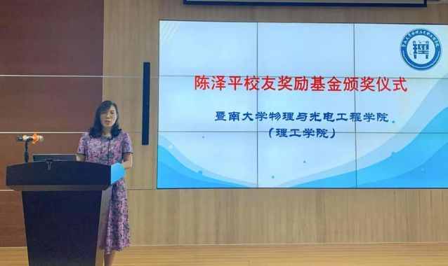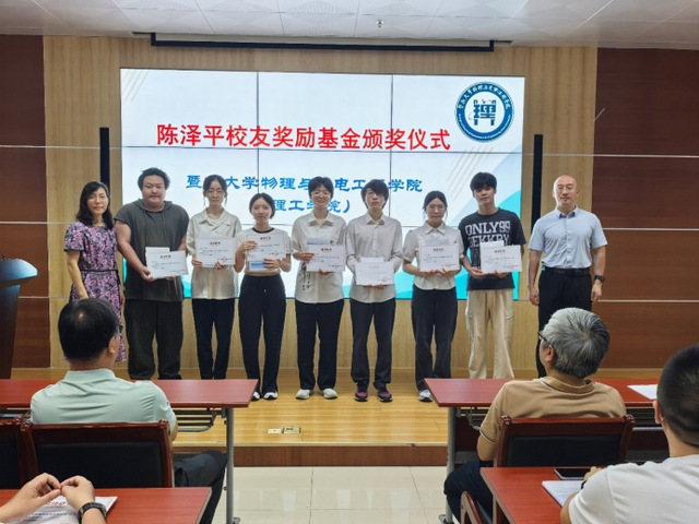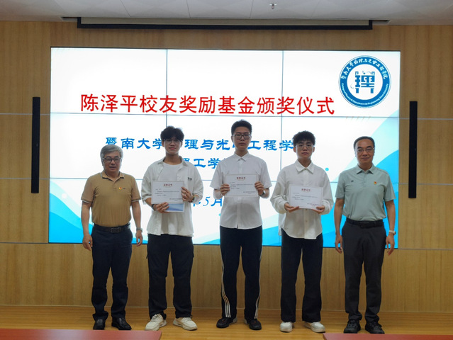 5月14日上午,物理与光电工程学院(理工学院)举行“陈泽平校友奖励基金”颁奖大会,大会表彰了2024年度获得该项基金奖励的老师和学生。学院院长关柏鸥、党委书记黄睿、副书记孙玉环、物理学系系主任孟辉、副主任谢伟广,获奖师生以及优秀本科生代表参加了大会。大会由物理学系党总支书记幸江涛主持。