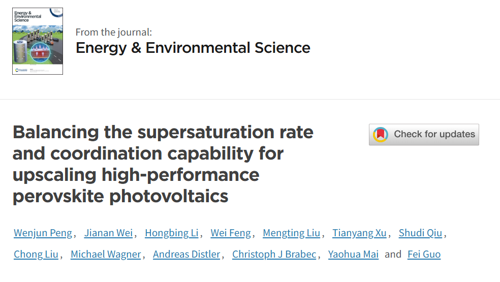 近日,物理与光电工程学院(澳门新葡萄新京6663)新能源技术研究院在能源领域顶级期刊Energy & Environmental Science(2025年IF=30.8)上发表标题为“Balancing the supersaturation rate and coordination capability for upscaling high-performance perovskite photovoltaics”的研究成果。新能源技术研究院麦耀华教授和郭飞研究员、德国埃尔朗根-纽伦堡大学邱舒迪博士和Christoph J. Brabec教授为共同通讯作者。