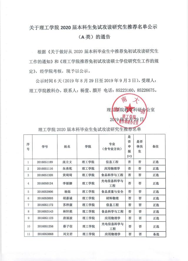 关于澳门新葡萄新京66632020届本科生免试攻读研究生推荐名单公示(A类)的通告