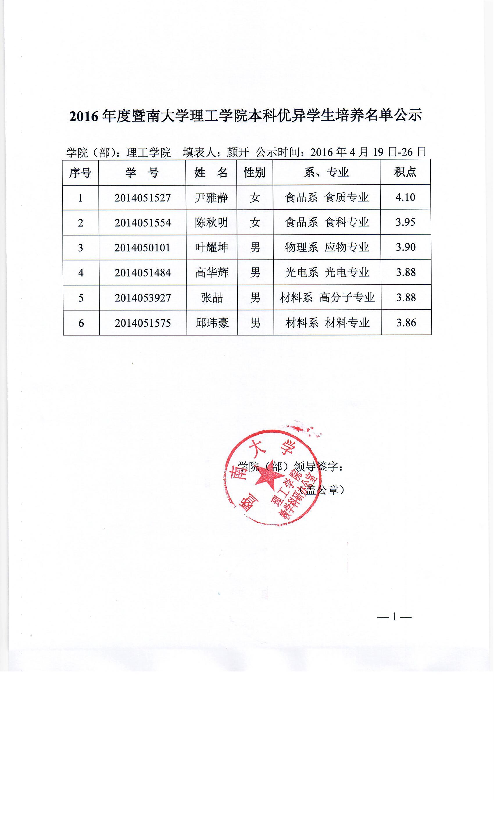 2016年度澳门新葡萄新京6663本科优异学生培养名单公示