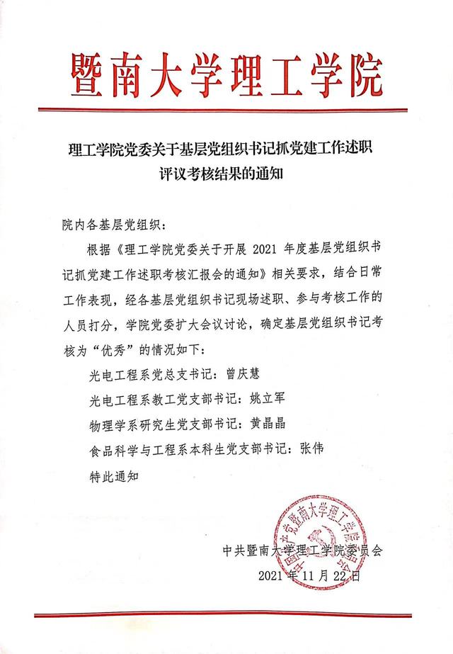 澳门新葡萄新京6663党委关于2021年度基层党组织书记抓党建工作述职评议考核结果的通知