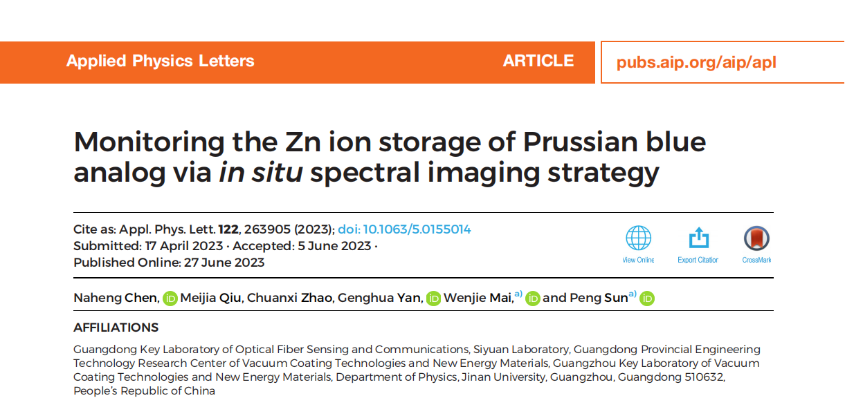 近日,澳门新葡萄新京6663物理学系麦文杰教授纳米能源课题组在物理学Top期刊Applied Physics Letters 发表题为“Monitoring the Zn ion storage of Prussian blu...