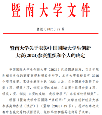 4月11日,学校发布《澳门新葡萄新京app官网关于表彰中国国[国际大学生创新大赛(2024)参赛组织和个人的决定》(教〔2025〕22号),表彰在本次比赛中获奖的组织和个人...